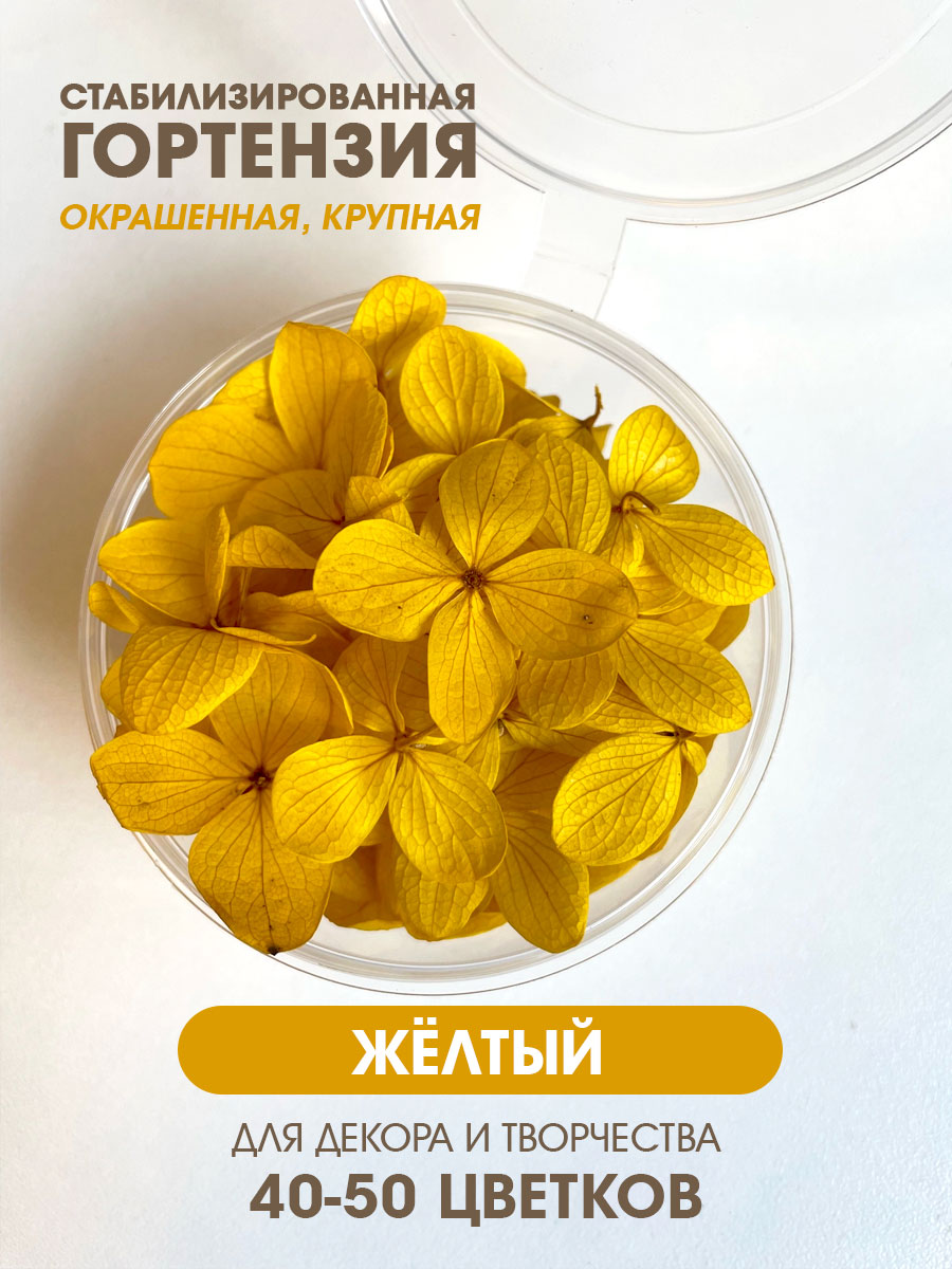 Представляем вашему вниманию уникальную коллекцию сухоцветов - стабилизированные соцветия "Гортензия" в желтом цвете! Этот товар идеально подойдет для создания свечей и саше, а также станет отличным дополнением к любому интерьеру.